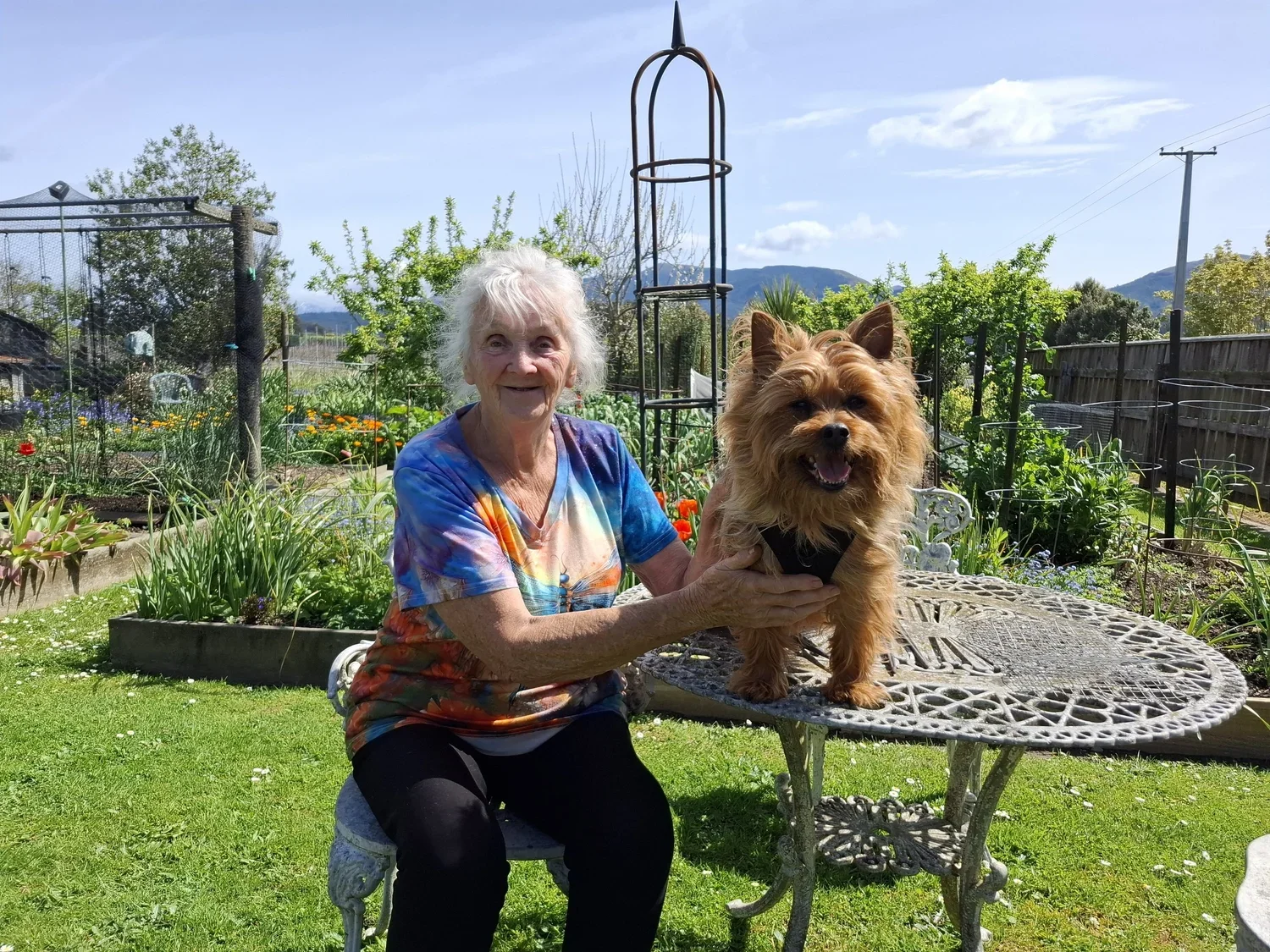 I live in Motueka on a large section with my Australian Terrier, Buddy and an aviary of canaries.